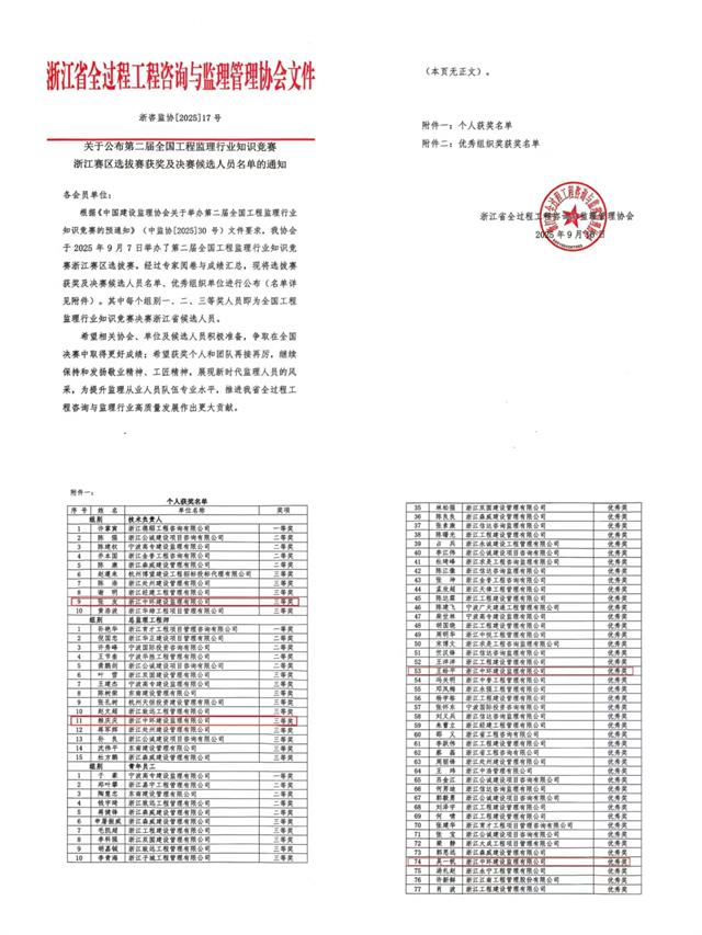近日,第二屆全國(guó)工程監(jiān)理行業(yè)知識(shí)競(jìng)賽浙江賽區(qū)選拔賽結(jié)果揭曉。在本次競(jìng)賽中,張友榮獲技術(shù)負(fù)責(zé)人組三等獎(jiǎng),賴慶慶榮獲總監(jiān)理工程師組三等獎(jiǎng),王給平、吳一帆榮獲總監(jiān)理工程師組優(yōu)秀獎(jiǎng)。其中,張友與……[查看詳細(xì)]